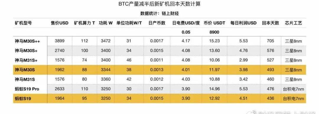 BTC第三次區塊獎勵減半時,BTC價格在8563美元左右震蕩,隨后呈震蕩上漲趨勢,目前比特幣價格為8900美元,上漲了近4%。基于當前挖礦全網難度,以電價0.35元/度計算,嘉楠耘智于2020年2月發布的阿瓦隆1066Pro礦機已達到關機幣價,30-40J/T的主流礦機均已達到關機幣價。另外阿瓦隆1146和阿瓦隆1041的電費占比達到97%,已非常接近關機幣價。除此之外,比特微于今年4月發布的M30系列比特幣礦機,包括神馬M30S++和神馬M30S+,以及今年2月比特大陸發布的螞蟻S19系列礦機,螞蟻S19和螞蟻S19Pro,電費占比超過50%。區塊鏈挖礦團隊-比特藍鯨的創始合伙人陳雷表示:“雖然大部分主流礦機達到關機幣價,但很快到五月底,豐水期將至電價比較低,電價大約在0.2-0.22元/度,還會再開機一部分老機型。”據鏈上財經統計,比特微新推出的最大算力神馬礦機M30S++售價為29209元/臺,減半后按照目前BTC價格每日利潤約為39元人民幣,回本周期約為2年;旗艦產品神馬M30S售價為14643元人民幣回本周期約為1年4個月,對標比特大陸螞蟻礦機S19的神馬礦機M30S,售價為13748元/臺,減半后回本周期需1年2個月。