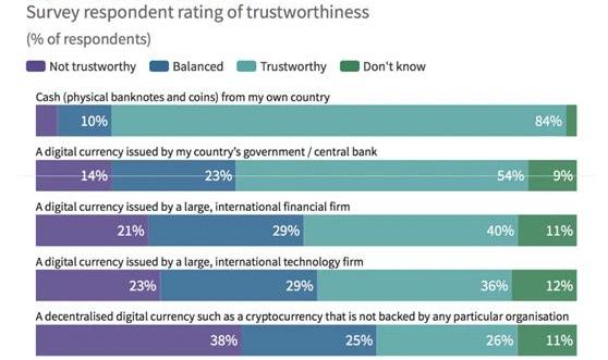 XRP/HKD-0.21%最近《經濟學人》的一項民意調查發現,只有26%的人信任去中心化的加密貨幣,人們更愿意接受央行發行的中心化數字貨幣。比特幣誕生已過十載,以它為代表的加密貨幣終于從小眾群體走進主流視野,它引發了廣泛關注,卻仍不被大多數人看好,這是為何?要采取怎樣的措施才能讓加密貨幣收獲更多主流人群的信任?一、比特幣信任度“最低”