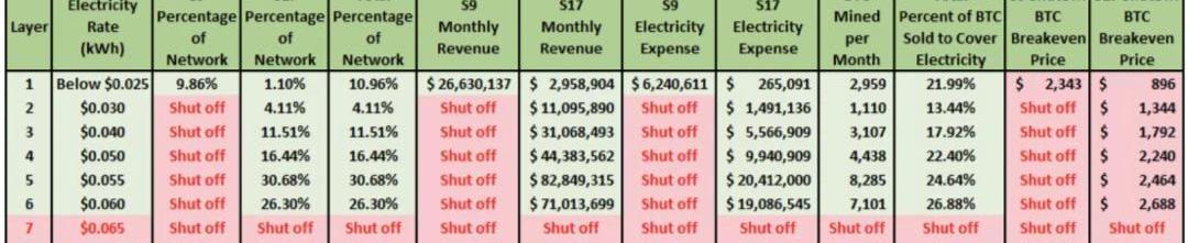 我們之所以對這些設定有十足的信心,來自如下幾點:BlockwareSolutions,LLC是北美最大的比特幣礦機分銷商之一。我們的客戶和合作伙伴在以下國家和地區挖礦:美國、加拿大、墨西哥、委內瑞拉、巴拉圭、南非、冰島、瑞典、挪威、不列顛哥倫比亞、德國、東歐、哈薩克斯坦、俄羅斯、阿聯酋、伊朗、蒙古、中國、日本和澳大利亞。我們的業務范圍廣泛:客戶群、戰略合作伙伴、業務伙伴和網絡,占網絡總哈希率的20%以上。我們與頂尖的礦池和最大的ASIC制造商進行著工作會議和同行評審,以深入了解每個地區的哈希率占比、電價和礦機型號的分布情況。我們參觀過中國成都30多兆瓦的礦場,以及紐約州北部和太平洋西北部富含水電的地區的運營情況。中國四川省、委內瑞拉、哈薩克斯坦、西得克薩斯、紐約州北部和太平洋西北地區的客戶和合作伙伴,每度電費都低于3美分,但大多都完全使用上一代的礦機。他們很少有動力升級到下一代礦機,因為電價很低,使用更高效礦機的好處也就不高了,所以沒什么理由升級到下一代礦機,因為成本巨大。比特幣價格在1萬美元時:每一層礦工都有健康的利潤空間當比特幣在1萬美元交易時,每一個礦工層級都享有健康的利潤空間,尤其是S17礦工設備。然而,對于第8層的礦工來說,S9礦機已接近關機價格點。即便比特幣在1萬美元的高價位,第8層的S9礦機也需要出售其生產的96.3%比特幣來覆蓋電費支出。