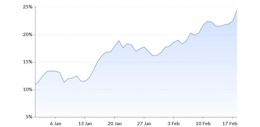 圖3:2/11–2/18中大市值幣種回報率年初至今,整個加密貨幣市場的市值增加了1000億美元,而山寨幣的漲勢超過了比特幣,其中山寨幣中市值最大的太坊回報率已經翻倍。我們可以看出以太坊與比特幣的一個月相關性在過去一周快速下降,由接近90%快速下滑至74,這也體現了以太坊目前獨立性的增強。根據AMBCrypto發出以太坊的研報發現,以太坊的網絡使用了近期有明顯的提升,活躍地址數和交易數較1月份有20%以上的漲幅,基本面也支撐以太坊目前的強勢走勢。