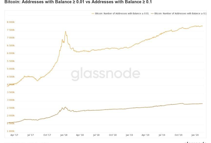 圖6:過去三年比特幣余額≥0.01的地址與余額≥0.1的地址數量-Glassnode情緒面