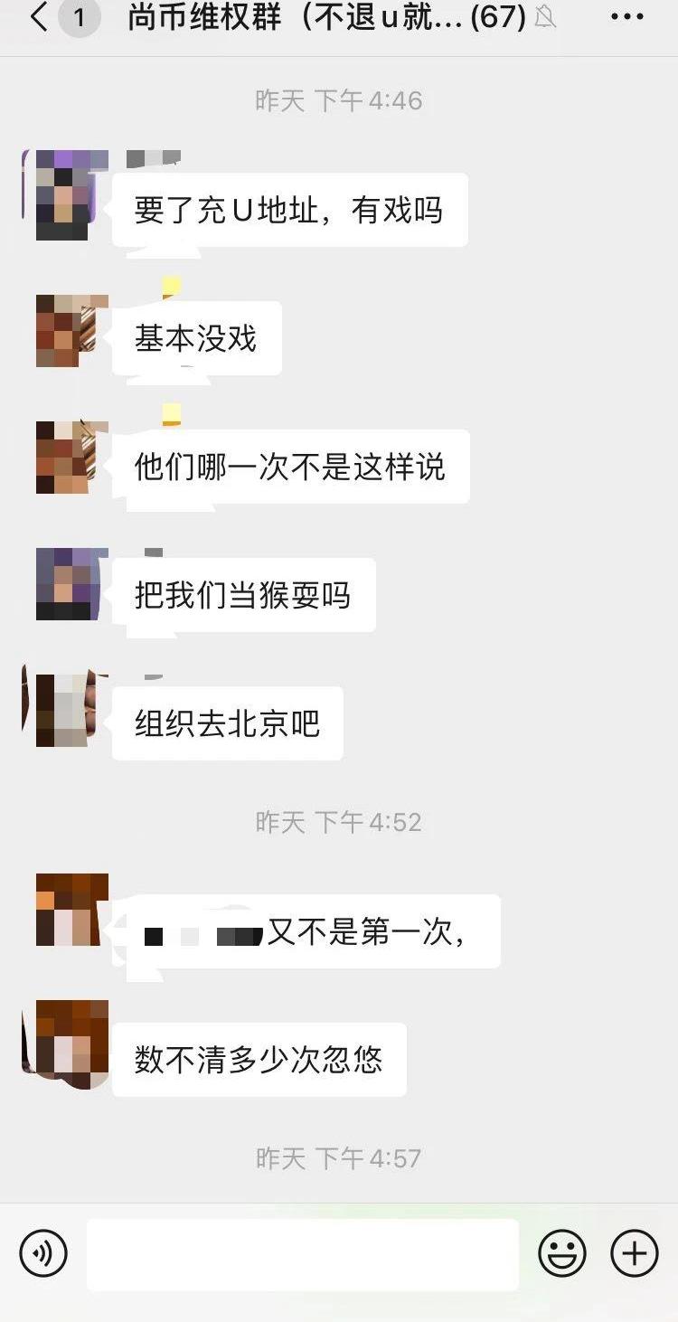 投資者對平臺失去信任1月10日,蜂巢財經聯系徐威詢問退幣事宜,但截至發稿對方暫未回復。在這幾日前,尚幣員工曾對蜂巢財經表示,正在做退幣的準備工作,會盡最大可能履行對用戶的承諾。該員工表示,尚幣還會繼續運營,希望得到大家的支持。“現階段能給用戶退幣的人可以說少之又少,不知道為什么不愿意等等呢,鬧來鬧去不知道有什么好處。”尚幣在此前的“辟謠聲明”中,曾提到在資金上遇到了問題。市場下行下,交易所的運營狀況的確容易受到波及,尚幣向外吐露苦衷。蜂巢財經就此嘗試追問資金情況,對方不愿作答。隨著1月10日再度爽約,尚幣又一次透支信任,這場維權重新陷入缺乏進展的泥潭中。11日上午,有維權者在群內曬出聊天截圖,圖中徐威說“sorry,昨晚還是有些意外,不過現在已經在加急。”群里涌現出一片討論聲,有人說“今天要是沒給,就報警吧”。有人則回復了兩個字,“耍猴。”
