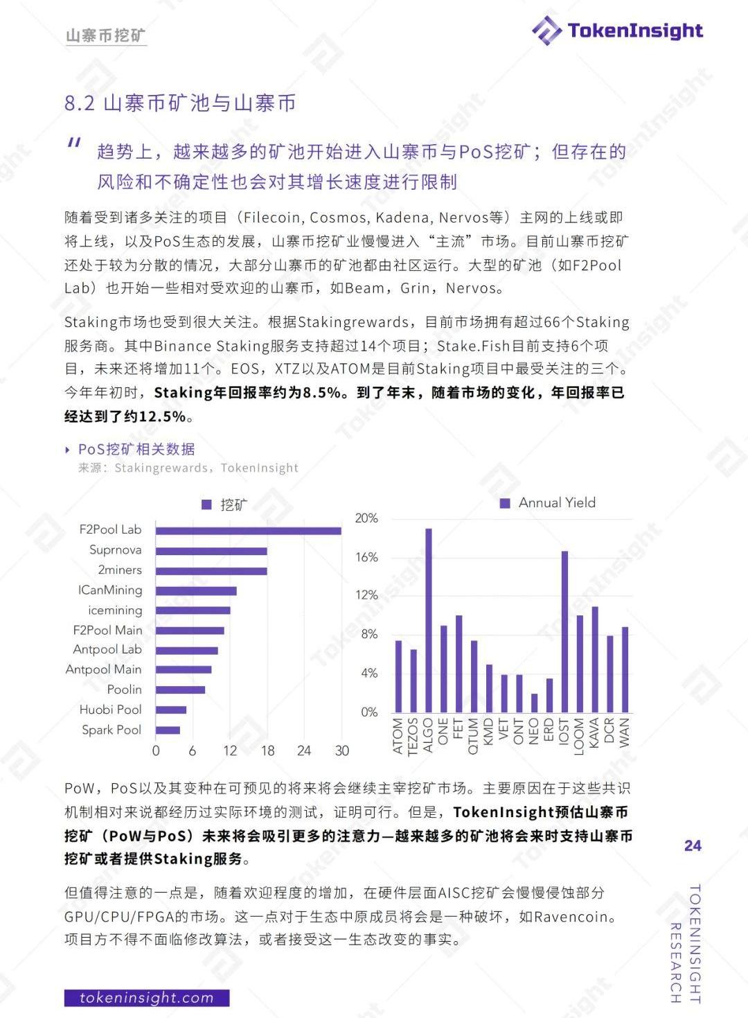XRP/HKD+1.83%要點總結:1.2019年全年比特幣平均算例增加80%,相比之下全年平均價格下跌1.9%。2.挖礦收益中,手續費占比從2.8億美元下降至1.6億,降低67%。3.全球比特幣網絡算力主要集中在中國、美國、加拿大、北歐、俄羅斯以及格魯吉亞等地區。4.第三次減半后供應量增長率降低約為1.7%,遠低于黃金的4.8%-6.2%和狹義貨幣發行量的5%。5.ASIC礦機生產商分布較為集中,2019年市場份額排名前四的生產商出貨量占市場總出貨量的95%以上。6.未來云算力的市場在海外。7.礦池的規范性不足,與獨立第三方機構合作是未來發展方向。8.對數字資產挖礦持進步和積極態度大多數為發達國家,未來監管方向偏正面。9.2019是圍繞著數字資產進行金融服務的元年,未來將會產生更多的金融產品,競爭也會更加激烈。10.山寨幣挖礦大多數采用GPU挖礦,主要集中在北美,歐洲地區。11.PoS正在加快速度的被行業里所接受,同時可以和DeFi,交易所借貸等服務一起形成一個生態系統,目前平均收益在年化8%-12.5%。2020預測:1.預計比特大陸、嘉楠耘智、比特微、億邦國際將分別占據2020年SHA256ASIC礦機市場占有率為63%,18%,10%和7%。2.第三次區塊獎勵減半短周期對比特幣價格影響有限,長期來看會對比特幣價格提供動力。3.海外的礦場在2020年預計會以更快的速度爆發建設。4.礦池會一步步的加入山寨挖礦,但市場潛力巨大同時也存在很大風險。5.更多的云算力產品將會被推出,海外市場更受歡迎。6.山寨幣挖礦可能會一步步從GPU/CPU走向FPGA,長期看可能會慢慢的被ASIC挖礦所占領。7.虛擬貨幣的衍生品會逐步推出,并且發展為定制化服務。對比傳統金融的體量,數字資產的衍生品市場有巨大的市場空間。