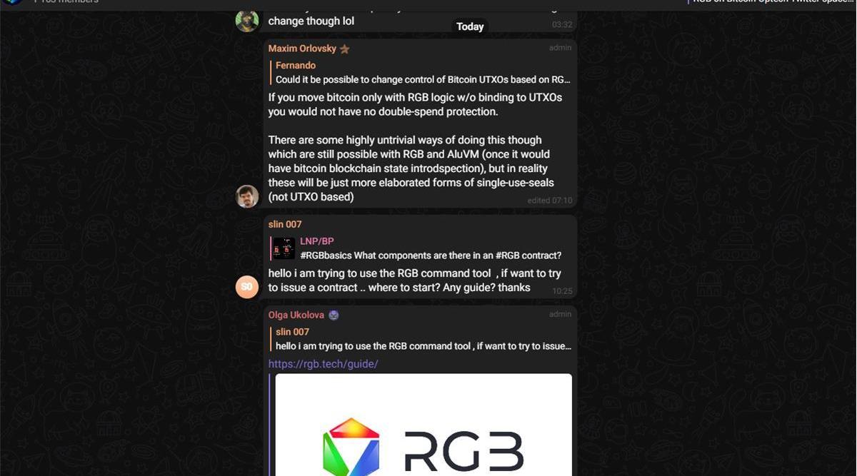 同時,RGB實際上也推出了可以收發基于BTC網絡資產的錢包,并且支持NFT相關功能。而在筆者調研的過程中發現,RGB相關的電報討論組依然保持著活躍,并且開發者熱衷于討論與解答技術相關的問題。