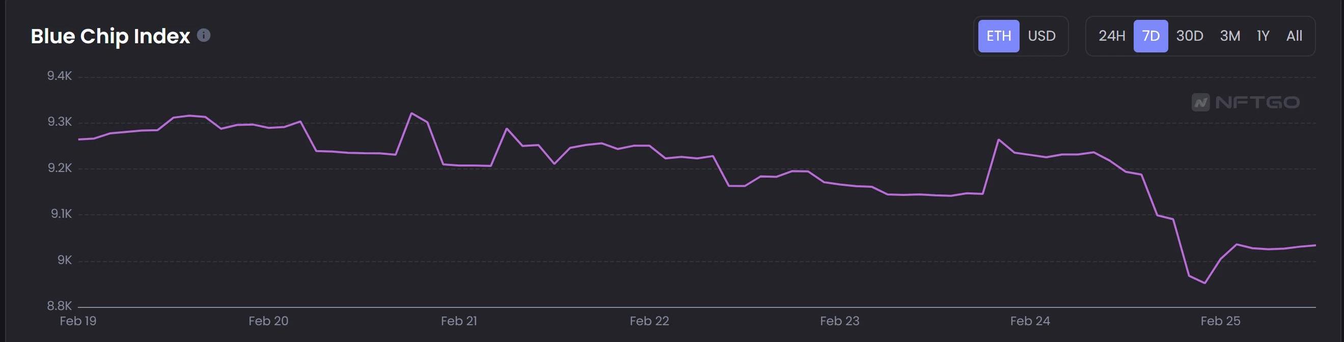 市場概況:本周NFT藍籌指數表現相對穩定,上周指數小幅度拉升后到了近三個月來相對中立的位置,本周藍籌指數在此位置上震蕩波動,整體較為穩定,2月24日突然下跌。