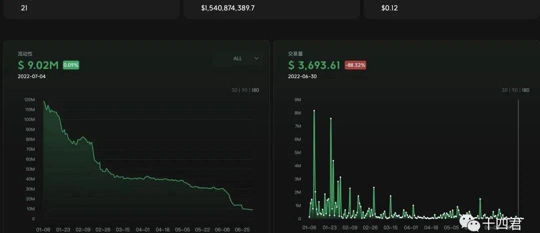 如下圖是o3swap的流動性總量和交易量趨勢,近半年已然跌去90%,或許是因為去年8月的質押資產被盜案導致不斷式微吧。