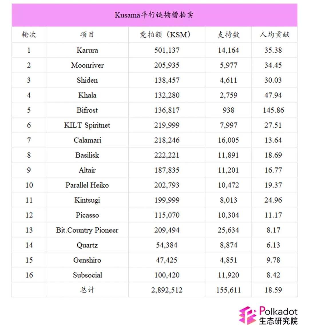 因此,前五個插槽有各種特殊情況存在,一個是做的很早期、底蘊很扎實的Acala先行網Karura獲得了遠超其他項目的支持,二是一些項目還在做準備,因此并沒有參與第一輪。