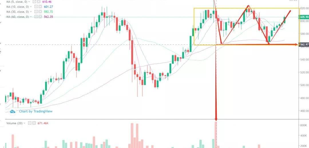 簡單點,4H周期中樞底部562,頂部壓力位置620,這輪上漲是BTC帶動,無量上漲,后期很難直接啟動行情,大概率回踩中樞中軸線590-600左右,再觀望是否有跟風的機會。主要還是以BTC為風向標。
