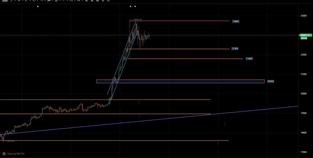 如圖所示,昨日比特幣收線為陽線帶長上影線結構,說明上方阻力較大,但日內存在上漲慣性。從小時級別來看,昨天比特幣沿加速通道一路上漲,并放量創出新高,形成一個超買的高點23880,隨后二探再次確認該位置的阻力效應,即可認為23880附近為有效供給區;二探后的下跌低點22300附近可視為短期支撐。后續比特幣大概率走收斂震蕩結構,關注明天收線結構能否形成日線級別孕線結構。