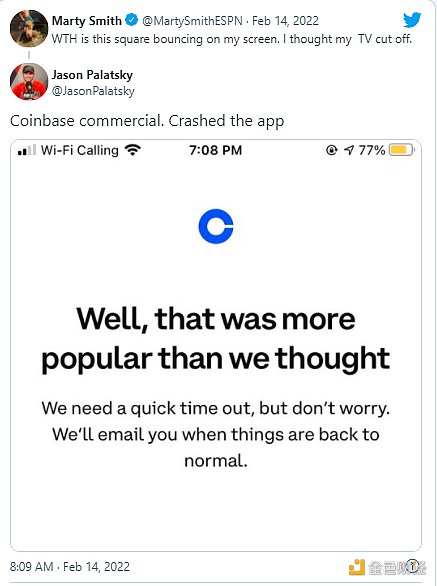 Coinbase的商業廣告無疑及其成功。超級碗廣告播出不久,人們在推特上表示Coinbase的網站和應用程序已經宕機崩潰。