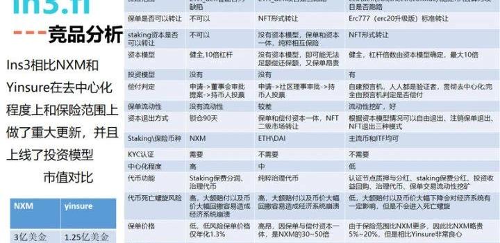 INS3更具競爭力的:資本模型,投資模型,保險精算定價模型,相對NXM和Yinsure在去中心化程度和保險范圍上做了重大升級。
