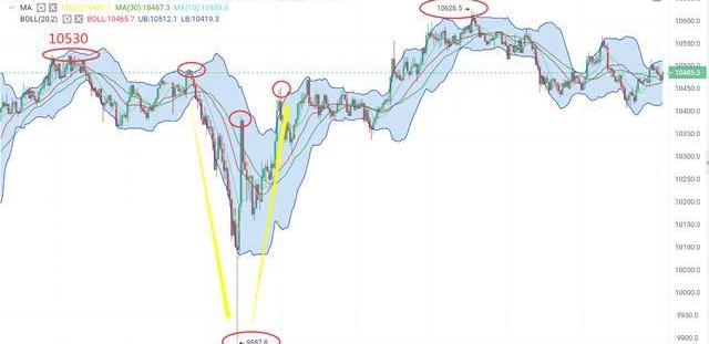 昨日行情早間下跌一波之后,整個日間行情都是處于反彈中,于下午6點左右抵達日間最高點10530附近,然后行情開始震蕩下行,于晚間10點50分的時候,再次創新低,抵達最低點9887一線附近;緊接著行情迅速反彈,在短短的10分鐘內就收回來下跌的區間,在整個尾盤都處于反彈中,于今天早間5點的時候,抵達高點10630附近。在K線圖上整體呈現出“V”型反轉形態,這是比特幣要逆轉空頭了嗎?
