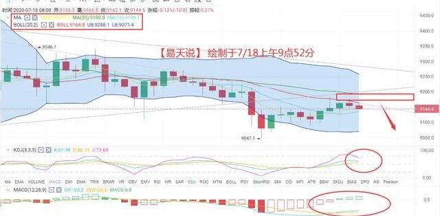 我們再從這個4小時圖來看一下,目前的這個布林帶已經開始向下收口,隨著昨天的這波行情的反彈,比特幣的行情昨天上攻了一波布林中軌的壓力線,有數次試探,但是一直沒有有效突破,比特幣行情一直處于BOLL中軌下方,目前是在承壓回落;下方的KDJ指標目標已經開始勾頭向下,有形成這個死叉的跡象;能量指標MACD快慢線位于零軸下方,金叉向上運行多頭能量逐漸釋放中;綜合來看,易天老師(aphz8705)認為日間行情依然會有一波反彈,上方壓力位重點關注9180-9200區域!