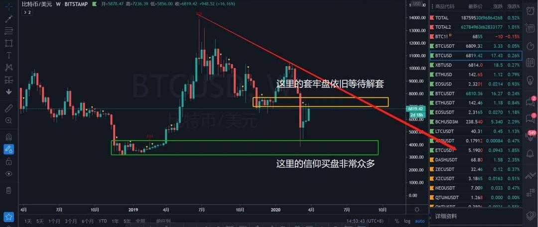回顧BTC近兩周的走勢,周線級別來看在連續放量下殺后價格呈現一個多頭信仰激增,供應力量略顯不足的一個狀態,周線級別的趨勢仍舊是一個安全的下降過程,多頭將價格反攻至7000一線,也不足以改變空頭背景的真實存在,目前來看,仍然是空頭趨勢,多頭的力量只能算是下跌趨勢中的反彈,未來大概率會繼續下跌