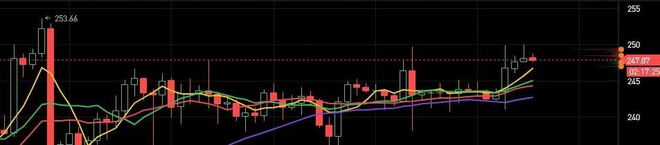 太子均線小死叉強行走出來了,日線形態形成一個標準的收斂三角,目前也到了快變盤的時間節點,結合量能來看回踩的概率大一點,暫時繼續持幣為主,后面看往哪邊突破然后順勢而為。壓力位:262,支撐位:248。