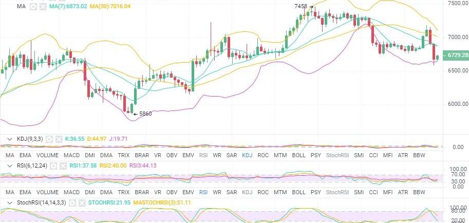 今日于凌晨1點多達到高位7179附近,凌晨至早間在7000上方高位盤整,7點多之后短期遭遇瀑布最低跌至6582附近;從6780漲至7179再跌至6582完成“畫門”上演過山車!多頭拉升將近400點波幅,凌晨后行情再次回落將近六百點回落,這樣的過山車試走勢,可謂完全按照一風昨日的布局思路在走。目前行情在6700附近走一字橫盤,當前價格6700。