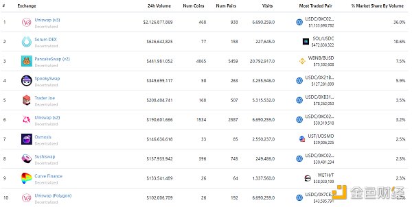 過去24小時去中心化交易所的交易量 數據來源:coingecko