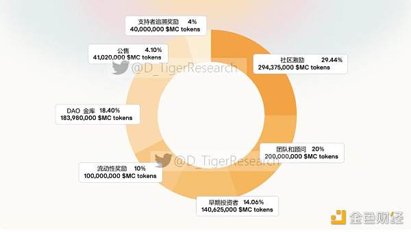 Merit Circle 的代幣為$MC,總供應量為10億枚,除公開發售的代幣之外,其他分配均設有鎖倉或線性釋放機制,初始的循環流通量為7900萬枚MC。且代幣將在代幣生成事件 (TGE) 中分發給 DAO 內的以下利益相關者: