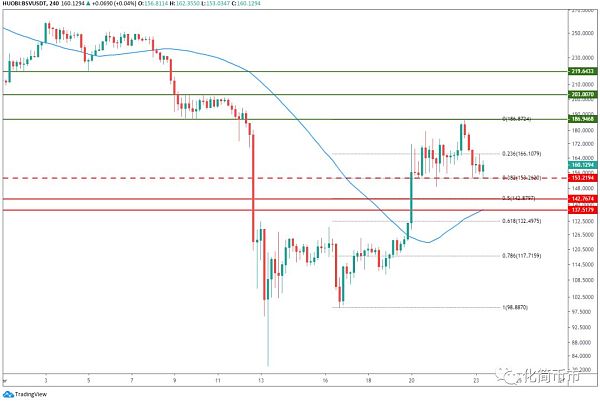 作為周末期間表現相對較為強勢的幣種,BSV雖然同樣跟進市場大流走出了一波回調,但是現有的回調強度并沒有導致該幣種跌回至前一輪反彈的回調0.382黃金分割支撐下方,目前回調半分位以及4小時50周期均線等短期重要技術支撐都沒有受到比較直接的挑戰,該幣種實際上仍然保持在一個比較明確的強勢區域內運行。