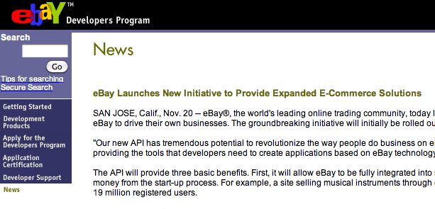 Ebay也在2000年12月發布了 eBay API,同時還發布了 eBay 開發者計劃。