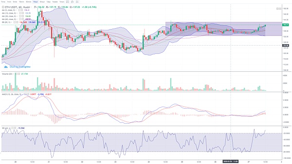 根據 CoinMarketCap 數據,ETH 近 7 日日均換手率為 95.68%,較三個月內日均換手率上漲了 19.82%,較上周日均換手率下降 19.25%。ETH 目前處于橫盤震蕩階段,價格在 $132 到 $142 之間震蕩,成交量處于逐步減少階段,市場觀望情緒濃厚。當 ETH 確認打破震蕩通道的上軌或下軌之后,才能明確接下來的價格進程。
