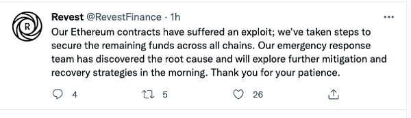 XRP/HKD+2.59%2022年3月27日,成都鏈安鏈必應-區塊鏈安全態勢感知平臺輿情監測顯示,DeFi協議Revest Finance遭到黑客攻擊,損失約12萬美元。