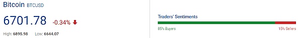 本文撰寫時比特幣價格出現小幅下挫,目前為6841.74美元,24小時跌幅為0.03%,市值為1252.57億美元。