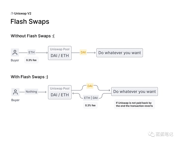 如果Uniswap池沒有收到足夠的DAI來兌換回當初用戶提走的ETH,那么,整個交易會還原。也就是,跟閃貸類似,在交易結束時,所有提走的代幣都需要進行支付或歸還,否則會被還原交易。