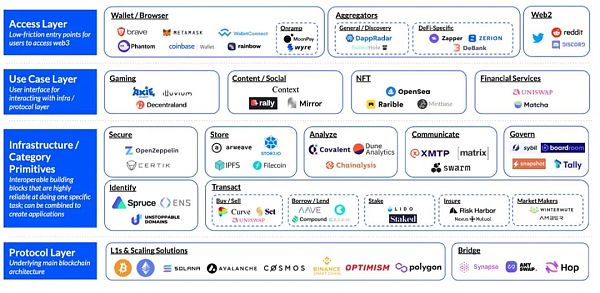 雖然目前Web3相關的應用如雨后春筍般涌現,但直到當前,Web 3的產業體系仍然還處于早期發展的階段。但從產業生態的角度,目前也基本形成了從底層技術到商業應用轉化的一套完整的系統。