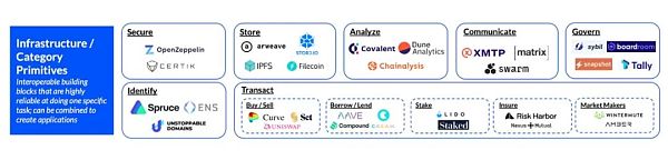 比如,交易工具Uniswap 能夠支持將一種資產交換為另一種資產,如今被廣泛地用于區塊鏈游戲之中。數據工具Arweave可以幫助任何人永久存儲數據,它的工作方式是將存儲的信息分布在一個稱為區塊圖的網絡中,可以通過傳統的網絡瀏覽器訪問。用戶身份工具ENS域名允許用戶以簡化的基于文本的方式來顯示過去復雜的以太坊公共地址,讓人們在共享、使用和記憶地址及其他數據變得更加容易,等等。