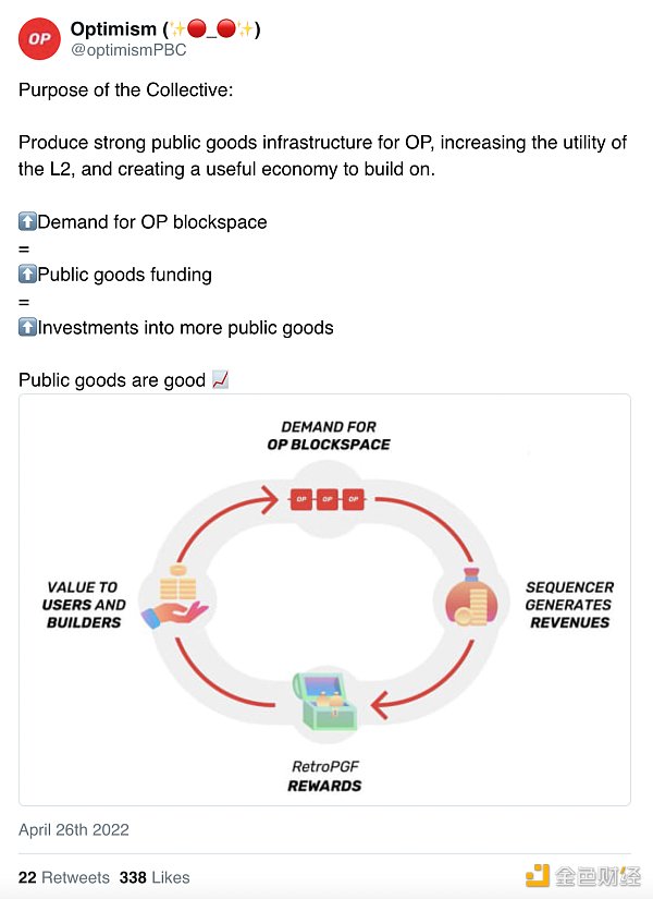 從 L2 區塊空間費用產生的收入被直接用于創新者和創始人,他們為 Optimism L2 建立有用的東西。RPGF 將資金投入到未來,讓公共產品建設者有能力建設,并保證如果他們建設有用的公共產品,會有資金等待他們。