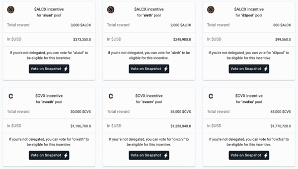 在 Curve War 的競爭結果日漸清晰之后,Convex 平臺的治理權同樣吸引了眾多用戶甚至 DeFi 協議方的競爭。用戶在 Convex 平臺上質押鎖倉平臺代幣 CVX 后會獲得 vlCVX 代幣,它同樣代表著對 Convex 協議擁有的 veCRV 的投票權的治理權。因此在這個機制中,誰擁有 CVX 更多,鎖倉后得到的 vlCVX 就更多,誰就擁有 veCRV 更大的治理權,也就可以影響 Curve 上某個穩定幣池的體量、滑點、收益等等。因此各類項目方逐漸意識到 CVX 以及 vlCVX 治理權的重要性。在他們大量囤積 CVX 代幣的同時,另一種更高效的影響 vlCVX 投票權的機制也被 DeFi 行業創造出來——對治理權的賄賂機制。