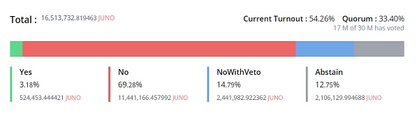 3月16日凌晨,Cosmos 生態智能合約平臺鏈 Juno Network 關于移除巨鯨賬戶資產的16號提案最終獲得通過,最終提案投票率創 98.58%(前所未有的治理參與度),其中 40.85% 的投票者同意該提案。