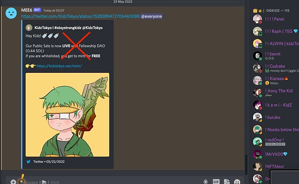 2022年5月23日,MEE6官方Discord遭受攻擊,導致賬號被盜,官方discord群里發布mint的釣魚網站信息。