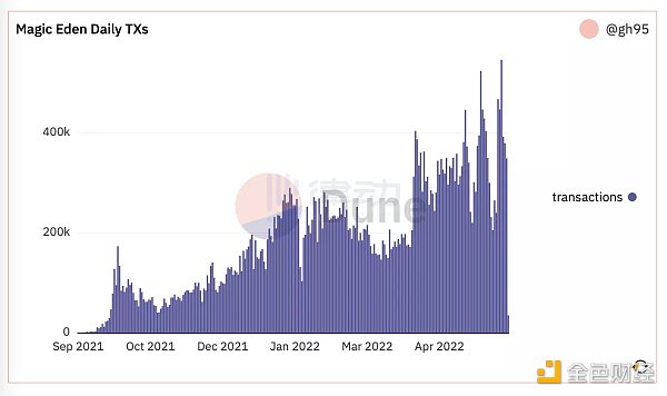 Magic Eden 上基于 Solana 的 NFT 交易在四五月份顯著增長(來源:Dune)