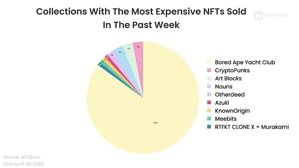 可以看出 BAYC 在 NFT 交易榜中是占比最大的。在過去一周中,超過 85% 的高價交易都來自 BAYC。排在 BAYC 之后的是 CryptoPunks,約占總數的 3%。BAYC 占據主導地位對其自身來說既是看跌也看漲。