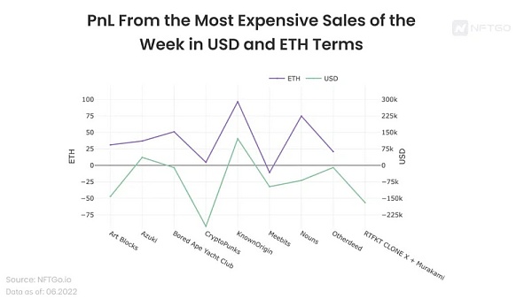 但隨之而來的問題是,這些持有者拋售高價藍籌 NFT 的代價是什么。我們先是研究了過去一周成交價前 200 的交易的平均利潤和損失。為了進一步說明 ETH 價格下跌對市場估值的影響,我們又繪制了 ETH 和美元計價的利潤和損失表(PnL),計算方法是將賣出價減去買入價。