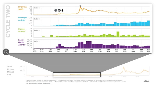 第一個加密周期在2011年達到頂峰。在此之前,就連比特幣愛好者也認為比特幣是一個有趣的實驗,不太可能有實際價值。后來,企業家們意識到可以用加密貨幣來做生意,今天許多最大的交易所、礦工和錢包都是在這個時期成立的。