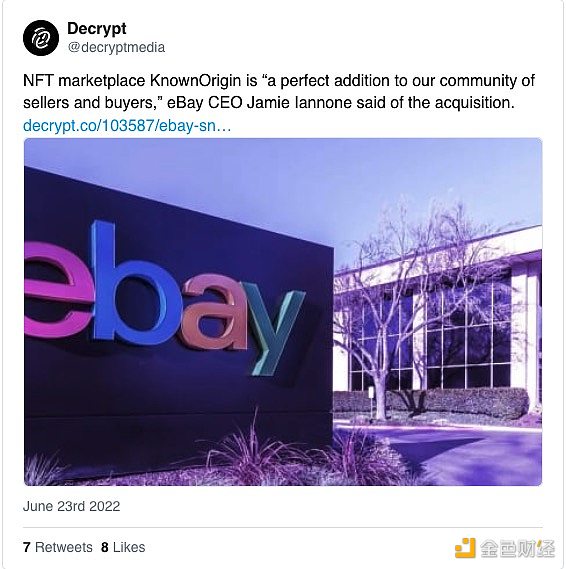 ? 2022年6月22日,電子商務巨頭eBay宣布收購NFT市場KnownOrigin。