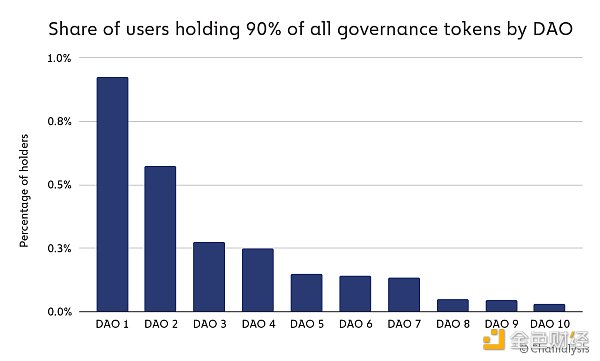 通過分析十個主要 DAO 治理代幣的分布情況,我們發現,在幾個主要 DAO 中,只有不到 1% 的持有者擁有 90% 的投票權。