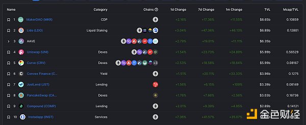 DeFi項目鎖定資產前十排名及鎖倉量 數據來源:defillama