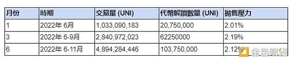 我們研究了UNI在1個月、3個月和6個月期間的潛在解鎖拋售壓力。這些估計是通過將解鎖的代幣數量與UNI過去在該時期的累積交易量進行計時而得出的。