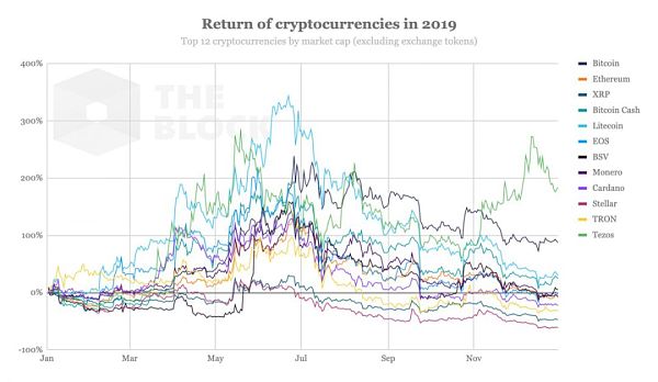 在2019年市值前12的加密貨幣當中(平臺幣除外),Tezos(XTZ)年漲幅184.4%,排名第一。BTC年漲幅87.2%,市值增加630億美元,雖然漲幅不是最大,但是表現最為穩健。