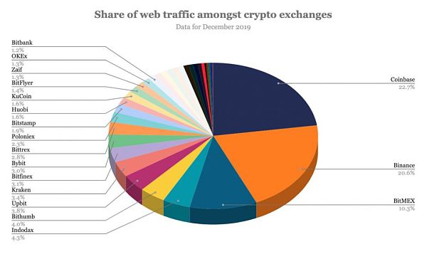 2019年12月,Coinbase,Binance,BitMEX三家交易所網站流量的合計市場占比超過50%。