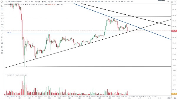 自跌破前期一直依托的上行趨勢線后,確立了BTC的階段性頂部,價格一路下探至20日線附近止跌,這個位置也是前期的籌碼密集區,存在一定的多頭撐盤,短線遲遲下探無果后,昨日晚間迎來了一波爆空反彈,不過最高點仍未突破前期頂點回落的下降趨勢線,這個位置也是50日均線壓制位置,也并未站回前期上行趨勢線上方,價格遇阻再次放量回落,目前已跌破20日均線和前期密集籌碼支撐區,5日線下穿10日線死叉拐頭構成下壓態勢,日線MACD指標線也有死叉的跡象,近期整體空頭趨勢明顯。
