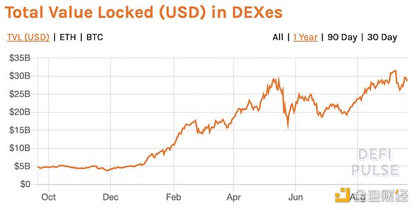 當前,DEX行業的鎖倉價值在300億美元左右。除去穩定幣交易對,市場TVL在200億美元左右。Tokemak支持的Uniswap,Sushiswap,Banlancer,Deversifi交易所,其TVL總計約120億美元。如下圖所示,Dex行業TVL持續穩定增長中。