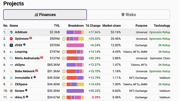 L2BEAT數據顯示,Arbitrum總鎖倉量最高,達23.6億美元,Optimism是目前比較易用的layer2,其次是DYDX,它采用ZK-Rollup的技術處理交易,所以Gas較低。