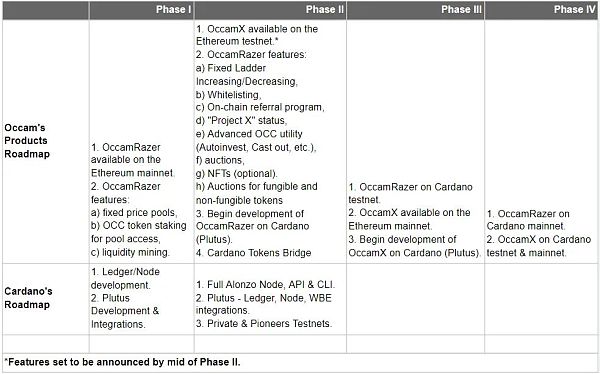 Occam.fi 會通過四個階段來最終為用戶整合所有 DeFi 模塊,目前已于 4 月中旬中在以太坊上部署了 OccamRazer,并同時通過該平臺為其代幣進行了 IDO,第二、三階段將分別在以太坊測試網、主網上發布 DEX OccamX,第四階段會將 OccamX 和 OccamRazer 部署到 Cardano 主網上。
