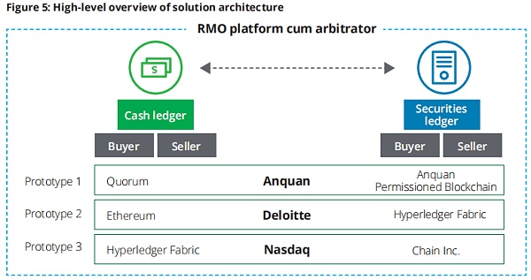 我們的技術合作伙伴在三個DLT平臺上創建了原型:Anquan permissioned blockchain和Quorum (Anquan)、Hyperledger Fabric和Ethereum (Deloitte),以及Chain和Hyperledger Fabric (Nasdaq)。