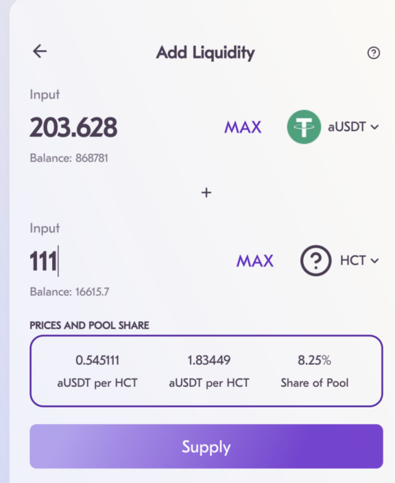 欲參與 Farm 獲取流動性挖礦收益,請先在 HurricaneSwap 中為指定的交易對提供流動性,并獲取相應的 LP-Token您可以點擊「Get HCT-*LP」,跳轉到相關 Token 的 Add Liquidity 頁面。